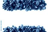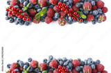 Red and blue berries. Various fresh summer berries on white background. Ripe raspberries, blueberries, and red currants, mint. Berries at border of image with copy space for text. Top view.