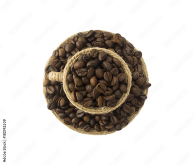 Coffee beans in a cup isolated on white background. Coffee background or texture concept.
