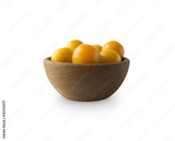 Bowl with yellow plums (cherry-plum) isolated on white background. Ripe plums with copy space for text.
