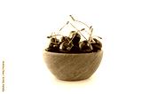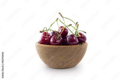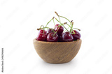 Sweet cherry berries in wooden bowl isolated on white background cutout. Cherry fruit in a wooden bowl with copy space for text.