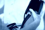 Closeup, hands and nurse with blood pressure machine for healthcare exam or test in home. Caregiver, doctor or monitoring heart rate with patient, arm strap or health evaluation for medical results