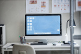 Modern medical office desk featuring large computer monitor displaying digital interface, keyboard, mouse, and various office supplies, dermatology anatomy charts visible on wall
