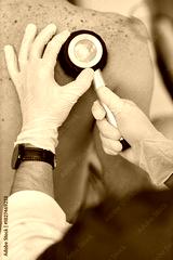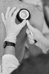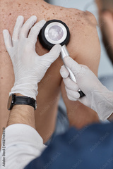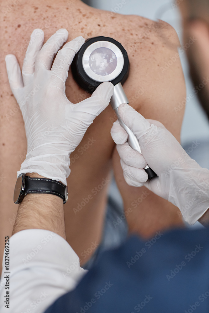 Caucasian middle aged man undergoing skin examination by male dermatologist using dermatoscope on back, dermatologist wearing gloves and carefully inspecting moles for signs of skin conditions