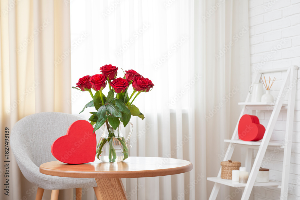 Living room interior with red rose flowers bouquet on round table with red heart gift box and blurred window curtains background