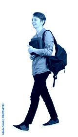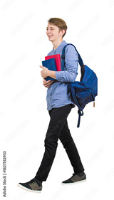 Full length portrait of contented student guy going to college as holds books and carries his backpack. Cheerful teenager walks happy with positive smile isolated on transparent background