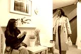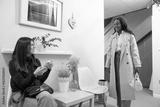 Two smiling women interacting in a clean, modern clinic waiting area, one sitting holding a phone, the other arriving