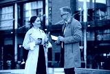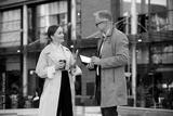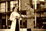 Happy business partners connect outdoors. Diverse professionals discuss work in an urban setting. Authentic collaboration and trust.