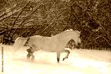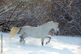 Beautiful white thoroughbred horse runs gallop in winter snow park