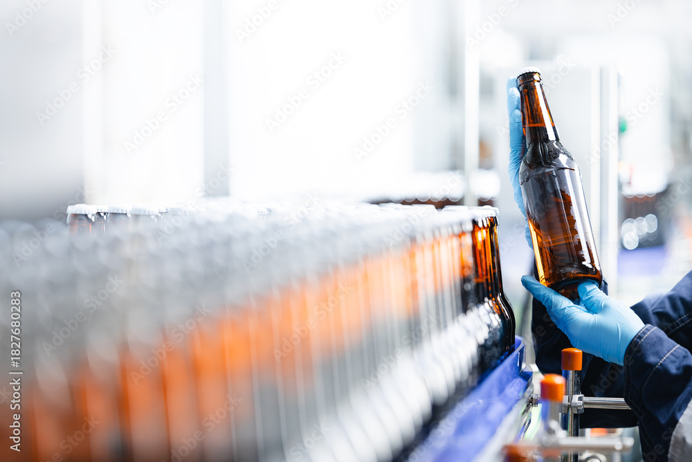 Automated beer bottling in modern brewery. Worker hold Brown glass alcohol bottles