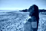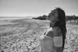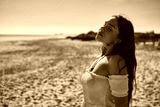 Young woman in white dress stands on beach with closed eyes, breathes deeply and enjoying moment of mindfulness outdoors, sunlight and sea breeze evoke calmness, balance, and emotional harmony concept