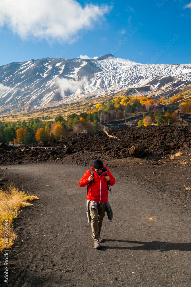 Mount Etna, Italy: panorama of the northern side of the volcano and a hiker walking on a lavic pathway