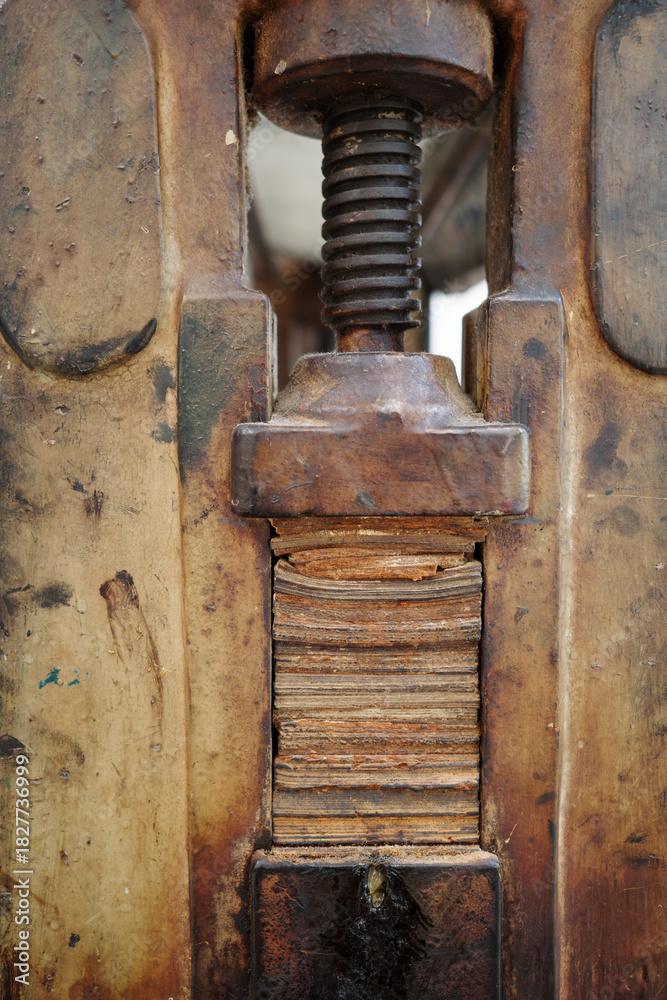 Vertical close up detail of an antique wooden press showing the threaded screw mechanism, worn texture, and layers of compressed wood in a workshop setting.