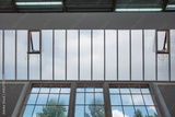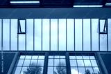 A low-angle interior view looking up at a translucent industrial skylight roof with open ventilation hatches. Below the sloped ceiling, large multi-paned windows reveal a green trees and blue sky.