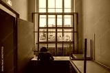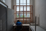 Rear view of a person sitting at a desk working in a room with a large window covered by a wooden grid structure, looking out at urban residential buildings.