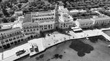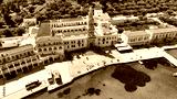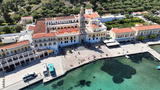 Aerial drone photo of iconic bay and holy Monastery of Archangel Michael Panormitis, Symi island, Dodecanese, Greece