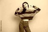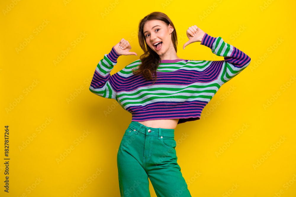 Young woman posing in colorful striped sweater and green pants against yellow background smiling and joyful