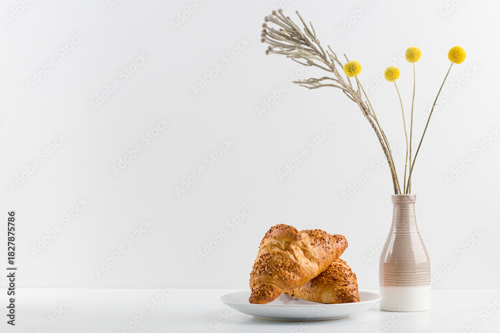 Croissant and a mug on a wooden stand, a vase , white background. minimalism. Copy space,