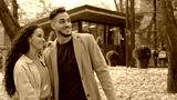 Hispanic happy couple in love outdoors talking in city fall season man and woman communicate in autumn park guy pointing away discuss talk with girl dating going away windy weather yellow foliage leaf