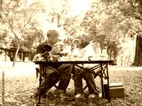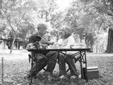 Happy retired senior Asian couple enjoying a healthy picnic and conversation in a lush park. The elderly man and woman are smiling and relaxing outdoors, celebrating love and active retirement.