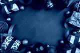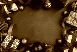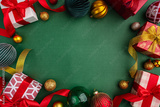 Red and gold Christmas ornaments and wrapped presents form a festive border on a green backdrop, leaving space in the center for text or design. Ideal for festive greeting cards, holiday banners