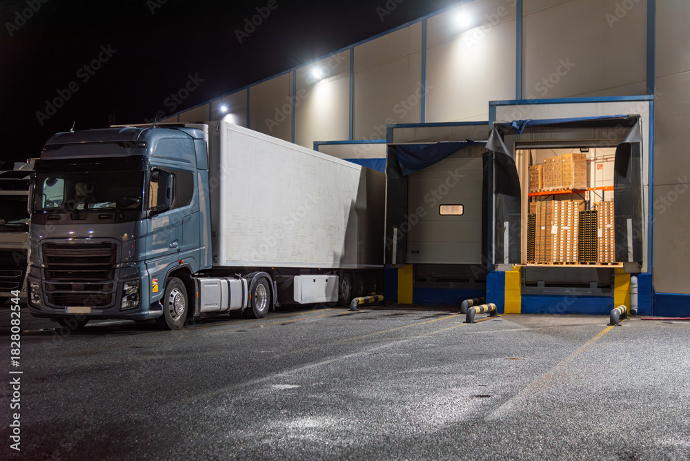 Several loading docks with trucks backed up and an open dock door showing palletized goods