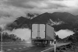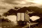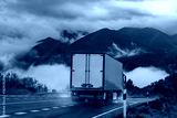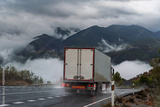 Refrigerated semi-trailer truck driving on a mountain road on a rainy day