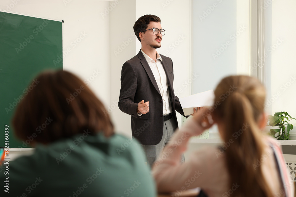 Teacher explaining information to children during lesson in classroom