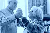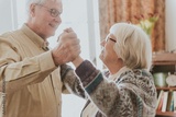 Elderly friends dancing happily indoors. Smiling seniors enjoying a dance. Joyful elderly pair sharing a moment. Senior friends embracing dance and happiness. Happiness and joy at old age.