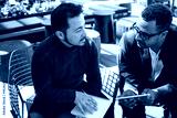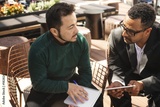 Two men in a business meeting outdoors, discussing ideas. One takes notes, the other holds a tablet. Business, meeting, discussion, ideas, outdoors. Men having conversation in cafe.