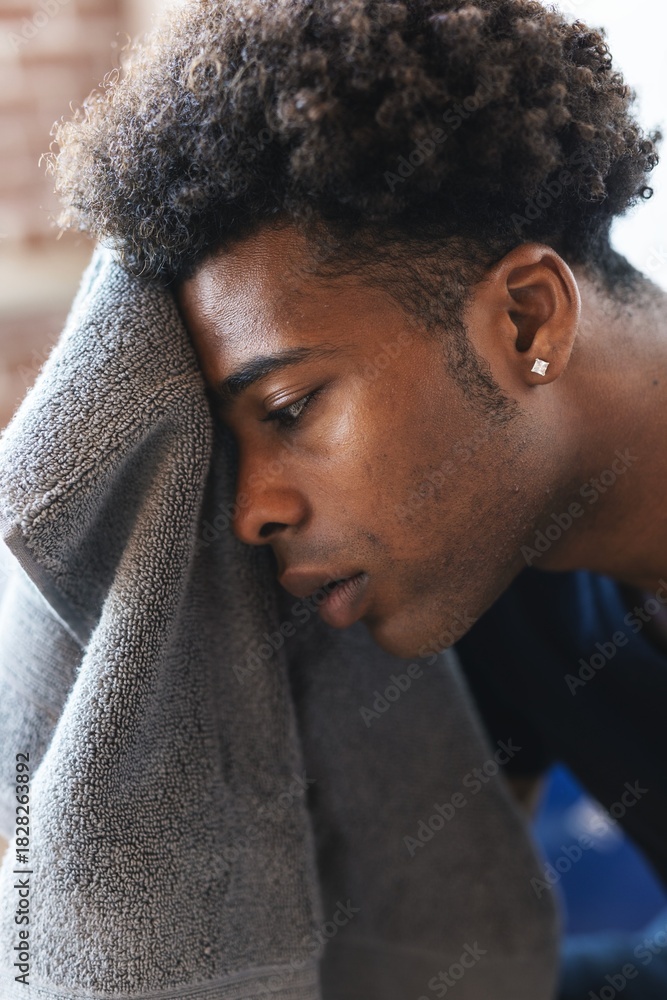 Black African American man with short curly hair using a towel. Close-up of a person with a towel. Relaxed expression, towel in hand, casual setting. African American man after exercise, tired face.