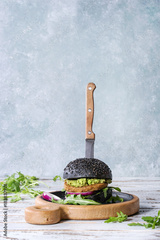 Homemade burger in black bun with avocado, arugula, onion on wood serving board over white wooden plank table. Rustic style. Homemade fast food.