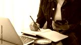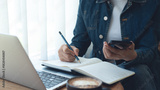 Business woman working on laptop computer, planning event schedule with calendar planner on office table. Woman planning startup project, writing on notebook planner, business organizing, close up