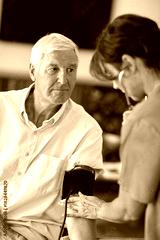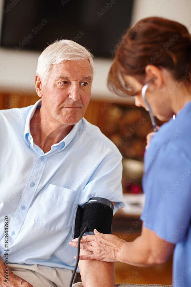 Senior man, nurse and blood pressure machine with patient for healthcare exam or test in home. Woman, caregiver or checking heart rate with arm strap for elderly care, monitoring or health evaluation
