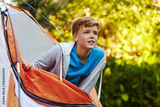 Camping, kid and thinking in tent outdoor with nature view, check morning weather and holiday. Vacation, boy child and thoughtful for weekend planning, adventure ideas or exploring campsite scenery