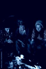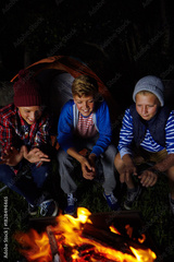 Night, kids outdoor and smile with bonfire for camping activity, childhood memories and bonding together. Late, happy friends or boys in nature with campfire for fun adventure, heating or warm hands.
