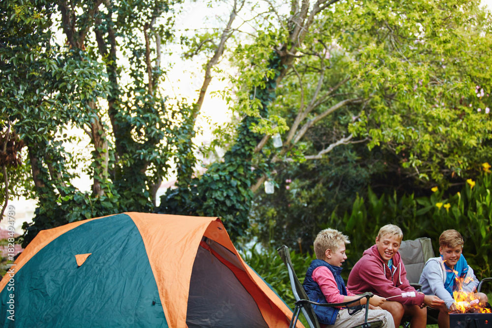 Children, camping and fire with marshmallow outdoor for travel, roasting smores or holiday fun. Smile, kids or friends with campfire for dessert, adventure and bonding together for vacation in forest