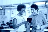 Tablet, smile and team with business people in office for ui designer update, coworking and app. Creative project, progress feedback and ux developer with employees in startup agency for review