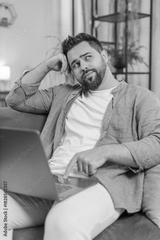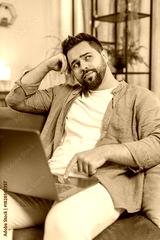 Overtired Caucasian young man with brown hair bored using laptop while sitting on sofa at home. Sleepy guy cannot concentrate on work and types lazily. Adult male is not interested in doing a project.