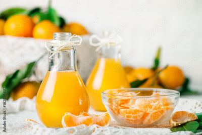 Fresh tangerines and tangerine juice. Healthy food, Selective focus.