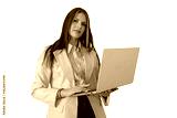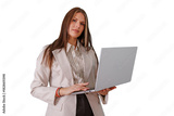 Young businesswoman using laptop, working on corporate project, standing with confidence, successful professional woman