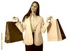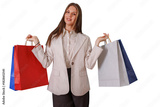 Happy woman holding shopping bags, enjoying consumerism, retail therapy, and discount shopping experience