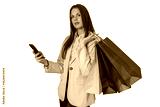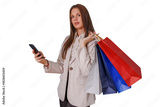 Woman shopping, holding bags and smartphone, checking deals and retail sales with transparent background