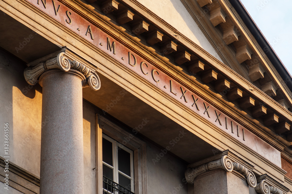 Neoclassical facade with Ionic columns and Roman numeral date in Milan, Italy