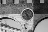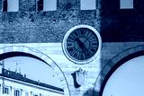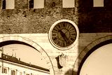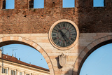 Close-up view of the large historic clock on the medieval city gate Portoni della Bra in Verona, Italy. The round clock with Roman numerals and 24-hour markings is set in a brick and stone wall with a