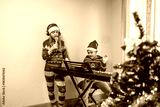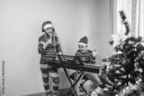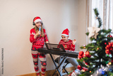 Young siblings wearing festive pajamas and santa hats playing an electronic keyboard and singing holiday songs together at home