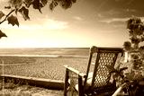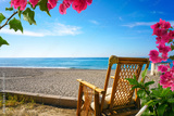 Wooden rocking chair overlooking a tranquil beach and turquoise sea, framed by vibrant pink bougainvillea flowers. Idyllic summer holiday, relaxation, and escape from the city concept.