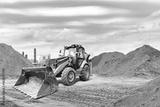 A yellow backhoe loader moves dirt and gravel at a construction site. Heavy clouds fill the sky, hinting at possible rain in the area