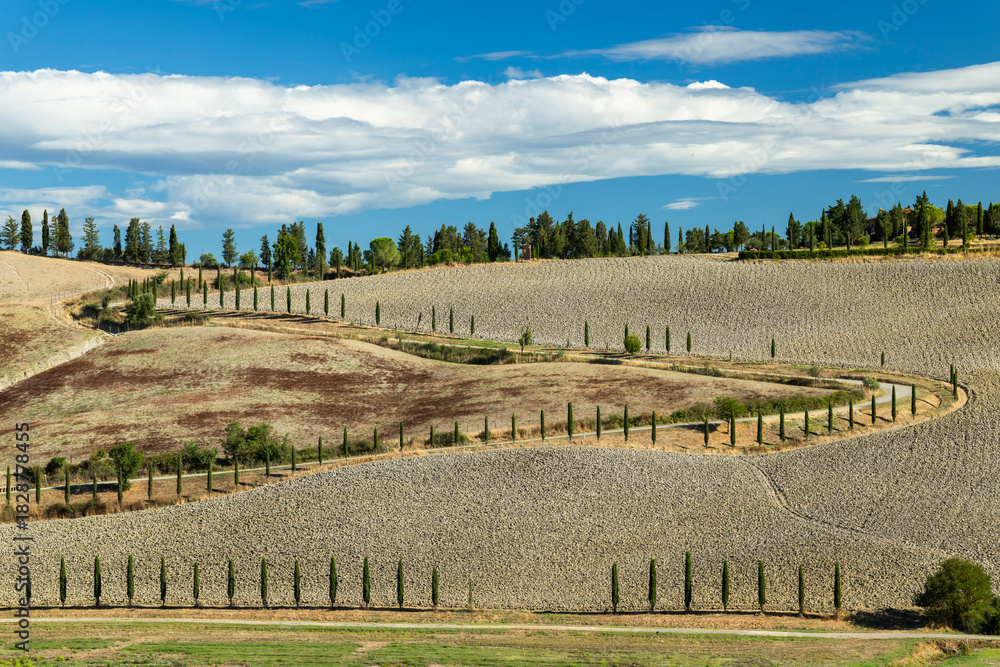 Tuscan landscape featuring winding road with cypress trees in Peccioli, Italy