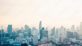 Aerial view of modern city skyline covered with smog and haze, indicating air pollution and PM2.5 problem. Useful for environmental, climate crisis, urban health, and air quality awareness content.