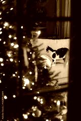 Cute cat sitting on couch at stylish christmas tree with glowing lights in cozy living room in evening. Merry Christmas and Happy holidays! Pet in atmospheric christmas eve
